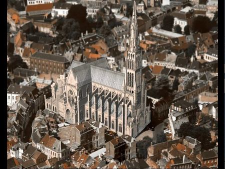 Œuvre d' Alexandre Grigny (Wikipédia) d'Arras, l'église est orientée au sud-ouest, son chevet déambulatoire et trois chapelles rayonnantes, d'inspiration normande, s'intègre au parcellaire étroit de la place. Les deux chapelles ouvrant sur les bras des transepts assurent son articulation au reste de l'édifice en ménageant le logement des annexes.