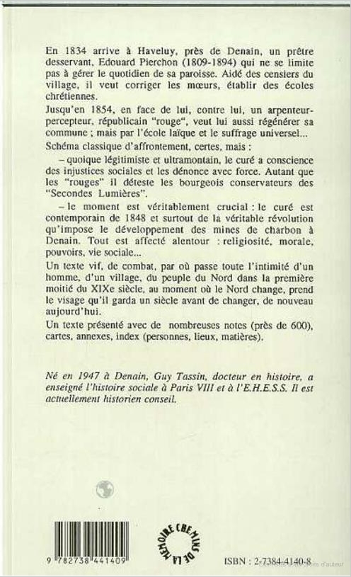 Verso du livre : Un village du Nord avant la mine : chronique d'Édouard Pierchon, curé d'Haveluy au XIXème siècle.
